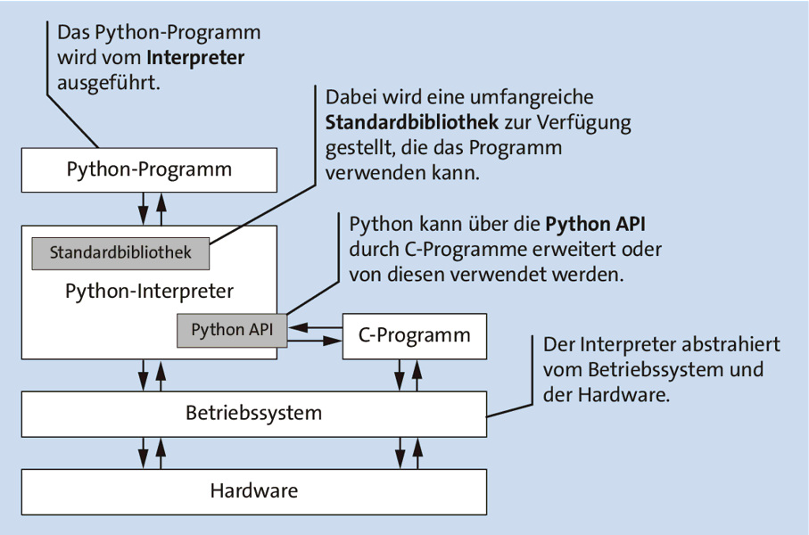 Obwohl Python viele Sprachelemente gängiger Skriptsprachen implementiert, handelt es sich um eine interpretierte Programmiersprache. Der Unterschied zwischen einer Programmier- und einer Skriptsprache liegt im Compiler. Ähnlich wie Java oder C# verfügt Python über einen Compiler, der aus dem Quelltext ein Kompilat erzeugt, den sogenannten Byte-Code. Dieser Byte-Code wird dann in einer virtuellen Maschine, dem Python-Interpreter, ausgeführt.