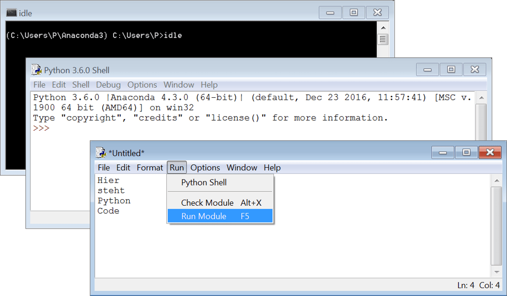 Jede Installation von Python umfasst neben dem Python-Interpreter selbst zwei wichtige Komponenten: den interaktiven Modus und IDLE.