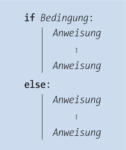 Der dem else-Zweig untergeordnete Code-Block wird nur dann ausgeführt, wenn alle vorangegangenen Bedingungen nicht erfüllt waren. Zu einer if-Anweisung darf maximal ein else-Zweig gehören. Im Beispiel wurde else in Kombination mit elif verwendet, was möglich, aber nicht zwingend ist. Abbildung 5.4 stellt den Aufbau einer if-Anweisung noch einmal übersichtlich dar.