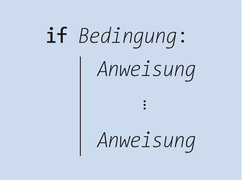 Die einfachste Möglichkeit der Fallunterscheidung ist die if-Anweisung. Eine if-Anweisung besteht aus einem Anweisungskopf, der eine Bedingung enthält, und aus einem Code-Block als Anweisungskörper (siehe Abbildung 5.1).