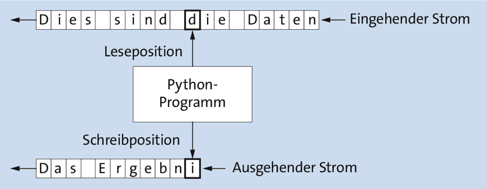 Es gibt zwei Standarddatenströme, die Sie bereits verwendet haben, ohne es zu wissen: Sowohl die Ausgabe eines Strings auf dem Bildschirm als auch eine Benutzereingabe sind nichts anderes als Operationen auf den Standardeingabe- bzw. -ausgabeströmen stdin und stdout. Auf den Ausgabestrom stdout kann mit der eingebauten Funktion print geschrieben und von dem Eingabestrom stdin mittels input gelesen werden.