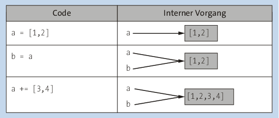 Dieses Beispiel ist analog zum vorangegangenen Beispiel mit den String-Instanzen: Die Liste [1,2] entspricht dem String "Wasser" und die Liste [3,4] dem String "flasche". Trotzdem hat sich die von b referenzierte Liste in diesem Beispiel verändert, was bei dem String-Beispiel nicht der Fall war.