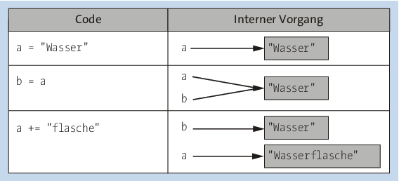 Der Knackpunkt befindet sich in der Zeile a += "flasche". Da str ein immutabler Datentyp ist, ist es nicht möglich, die bestehende str-Instanz "Wasser" durch Anhängen von "flasche" zu erweitern. Stattdessen wird an dieser Stelle eine neue str-Instanz mit dem Wert "Wasserflasche" erzeugt und anschließend von a referenziert. Die weiterhin von b referenzierte Instanz mit dem Wert "Wasser" ist davon nicht betroffen.