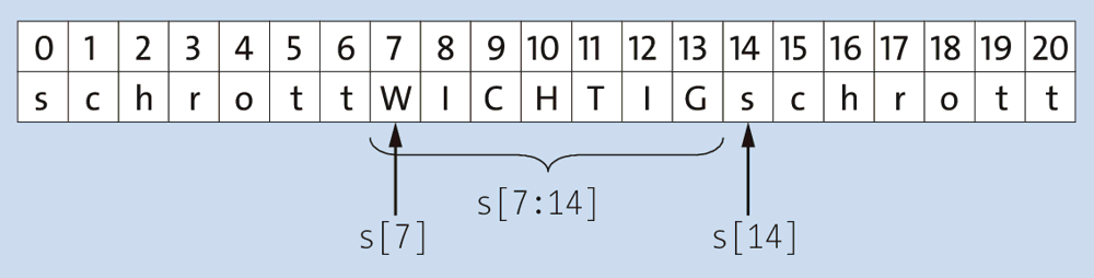 | s[i:j] | Liefert den Ausschnitt aus s von i bis j. | Abschnitt 13.1.4 |