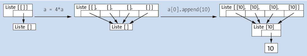 Zu Beginn referenziert a eine Liste, in der eine weitere, leere Liste enthalten ist. Bei der anschließenden Multiplikation mit dem Faktor 4 wird die innere leere Liste nicht kopiert, sondern nur weitere drei Male referenziert. In der Ausgabe sehen wir also viermal dieselbe Liste. Wenn man das verstanden hat, ist es offensichtlich, warum die dem ersten Element von a angehängte 10 auch den anderen drei Listen hinzugefügt wird: Es handelt sich einfach um dieselbe Liste. Abbildung 13.4 verdeutlicht diese Tatsache.