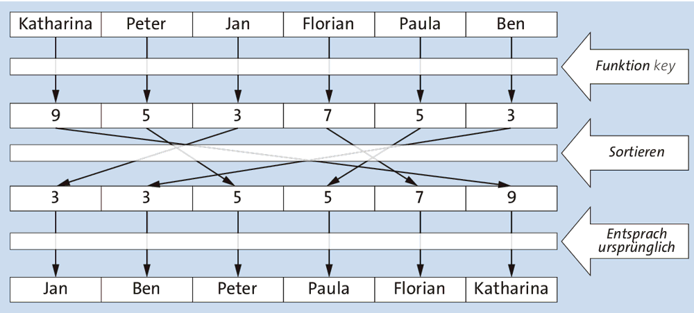 Immer dann, wenn der Sortieralgorithmus zwei Elemente der Liste vergleicht, beispielsweise "Florian" und "Jan", werden nicht die Elemente selbst, sondern die zugehörigen Rückgabewerte der Funktion key verglichen. In unserem Beispiel werden somit len("Florian") und len("Jan"), also die Zahlen 7 und 3, verglichen. Daher ist der String "Jan" in diesem Beispiel vor dem String "Florian" einzuordnen. Grafisch lässt sich dieses Beispiel wie in Abbildung 13.3 veranschaulichen.