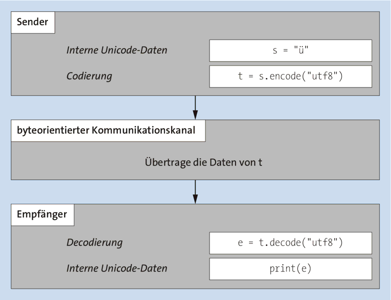 Das Schema in Abbildung 13.5 veranschaulicht den Transfer von Unicode mithilfe von Codierung und Decodierung.