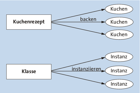 Mit einer Klasse allein kann man noch nicht sinnvoll arbeiten, da sie nur die Beschreibung eines Objekttyps darstellt, selbst aber kein Objekt ist.[ 87 ](Streng genommen sind in Python auch Klassen Instanzen sogenannter Metaklassen. Dies soll hier aber keine Rolle spielen. ) Man kann das Verhältnis von Klasse und Objekt mit dem von Backrezept und Kuchen vergleichen: Das Rezept definiert die Zutaten und den Herstellungsprozess eines Kuchens und damit auch seine Eigenschaften. Trotzdem reicht ein Rezept allein nicht aus, um die Verwandten zu einer leckeren Torte am Sonntagnachmittag einzuladen. Erst beim Backen wird aus der abstrakten Beschreibung ein fertiger Kuchen.