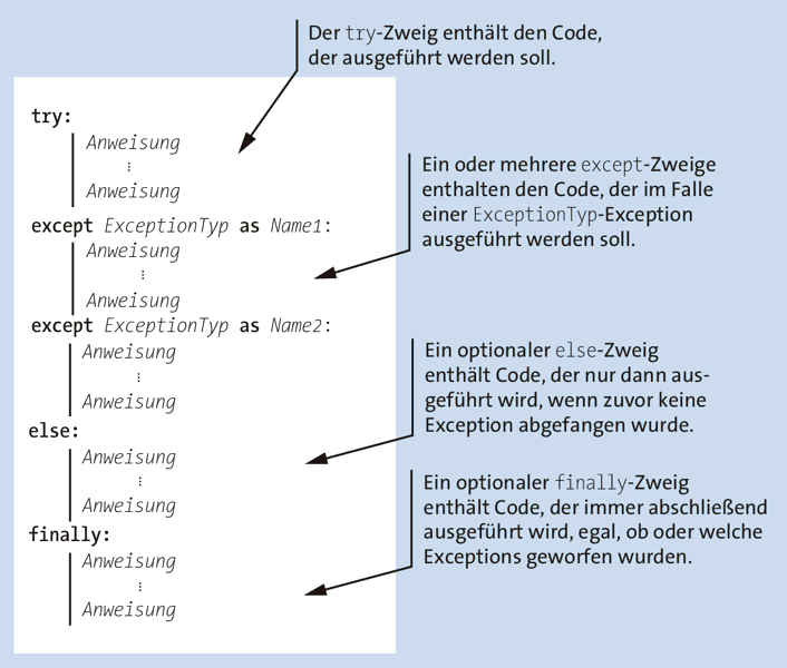 Abschließend noch einige Bemerkungen dazu, wie eine try/except-Anweisung ausgeführt wird: Zunächst wird der dem try-Zweig zugehörige Code ausgeführt. Sollte innerhalb dieses Codes eine Exception geworfen werden, wird der dem entsprechenden except-Zweig zugehörige Code ausgeführt. Ist kein passender except-Zweig vorhanden, wird die Exception nicht abgefangen und endet, wenn sie auch anderswo nicht abgefangen wird, als Traceback auf dem Bildschirm. Sollte im try-Zweig keine Exception geworfen werden, wird keiner der except-Zweige ausgeführt, sondern der else-Zweig. Der finally-Zweig wird in jedem Fall zum Schluss ausgeführt.