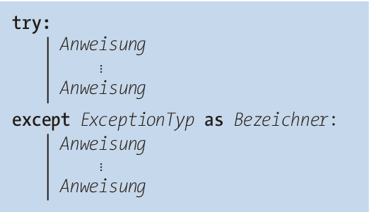 Zum Abfangen einer Exception wird eine try/except-Anweisung verwendet. Eine solche Anweisung besteht zunächst aus zwei Teilen:
