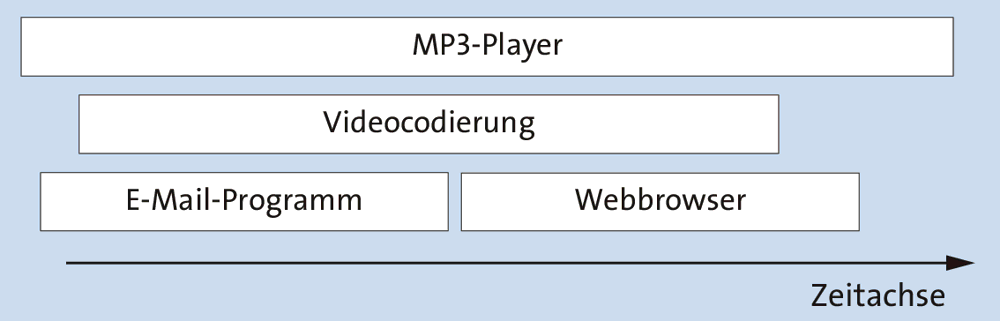 Wir sind es als Benutzer moderner Computer gewohnt, dass mehrere Programme gleichzeitig ausgeführt werden können. Beispielsweise schreiben wir eine E-Mail, während im Hintergrund das letzte Urlaubsvideo in ein anderes Format umgewandelt wird und eine MP3-Software unseren Lieblingssong aus den Computerlautsprechern ertönen lässt. Abbildung 32.1 zeigt eine typische Arbeitssitzung, wobei jeder Kasten für ein laufendes Programm steht. Die Länge der Kästen entlang der Zeitachse zeigt an, wie lange der jeweilige Prozess läuft.
