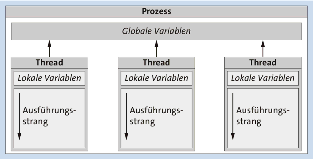 Nun kann ein Prozess aber auch mehrere Threads starten, die dann durch das Betriebssystem wie Prozesse scheinbar gleichzeitig ausgeführt werden. Der Vorteil von Threads gegenüber Prozessen besteht darin, dass sich die Threads eines Prozesses denselben Speicherbereich für globale Variablen teilen. Wenn also in einem Thread eine globale Variable verändert wird, ist der neue Wert auch sofort für alle anderen Threads des Prozesses sichtbar[ 127 ](Um Fehler zu vermeiden, müssen solche Zugriffe in mehreren Threads speziell mit sogenannten Critical Sections abgesichert werden. Wir werden diese Thematik später in Abschnitt 32.5.1 noch ausführlicher behandeln. ). Außerdem ist die Verwaltung von Threads für das Betriebssystem weniger aufwendig als die Verwaltung von Prozessen. Deshalb werden Threads auch Leichtgewichtprozesse genannt.