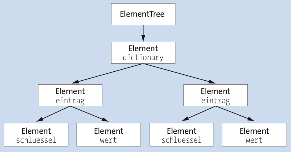 An dieser Stelle zeigen wir Ihnen die Verwendung von ElementTree an einem einfachen Beispiel. Dazu rufen wir uns erneut unsere Beispieldatei ins Gedächtnis, deren Zweck es war, den Inhalt eines Python-Dictionarys abzubilden: