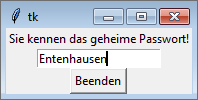 Auf analoge Art und Weise erzeugen wir im weiteren Verlauf der Funktion noch die beiden Buttons, die im Dialog zur Verfügung stehen sollen. Bei einem Button können auf ähnliche Weise wie bei einem Entry-Widget die Optionen text für die Beschriftung des Buttons und command beschrieben werden. Über die Option command wird eine Funktion festgelegt, die gerufen wird, wenn der Benutzer auf den Button geklickt hat. Im Falle des OK-Buttons setzen wir das command-Attribut auf die quit-Methode. Diese Methode stammt von der Basisklasse Frame und beendet den Dialog.[ 184 ](Wenn Sie das Beispiel in der Entwicklungsumgebung IDLE ausführen, lässt sich der Dialog möglicherweise nicht beenden. Versuchen Sie in diesem Fall, das Beispiel direkt auszuführen. )