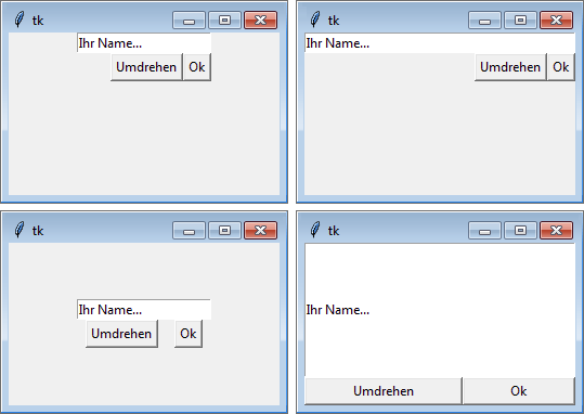 Wie bereits gesagt, kann dem Packer ein Layout vorgegeben werden, nach dem er die Widgets anzuordnen hat. Im Beispielprogramm haben wir das erreicht, indem wir beim Aufruf der Methode pack der beiden Buttons den Schlüsselwortparameter side mit dem Wert "right" übergeben haben. Der Packer platziert Widgets mit dieser Layoutanweisung rechtsbündig an der Oberfläche. Im Folgenden möchten wir exemplarisch anhand des inzwischen bekannten Programms demonstrieren, wie der Packer funktioniert.