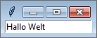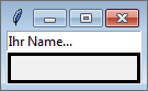 Die Methode createWidget wird als letzte im Konstruktor aufgerufen und hat die Aufgabe, die für unseren Dialog benötigten Steuerelemente zu initialisieren. Dazu wird zunächst eine Instanz der Klasse tkinter.Entry erzeugt, die ein Eingabefeld repräsentiert. Dieses wird dann mittels pack auf die Oberfläche gebracht. Danach wird eine Instanz der Klasse tkinter.StringVar unter dem Namen self.name erzeugt, über die wir später den im Eingabefeld self.nameEntry eingegebenen Text auslesen oder verändern können. Initial setzen wir den Text auf »Ihr Name...« und melden die Steuerelementvariable beim Entry-Widget an. Dies geschieht, indem Sie wie bei einem Dictionary den Schlüssel »textvariable« der Entry-Instanz beschreiben.