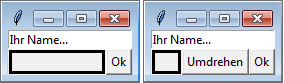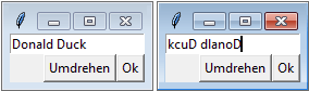 Zum Einstieg in die Verwendung von tkinter möchten wir ein einfaches Beispielprogramm präsentieren und anschließend besprechen. Das Programm bringt einen Dialog auf den Bildschirm, der den Benutzer dazu auffordert, seinen Namen einzugeben. Durch einen Klick auf einen Button wird der Name umgedreht, die Buchstaben erscheinen also in umgekehrter Reihenfolge. Ein weiterer Button beendet den Dialog. Die folgende Grafik zeigt, wie die Oberfläche später aussehen wird. Links sehen Sie die GUI vor dem Anklicken des Umdrehen-Buttons und rechts danach.