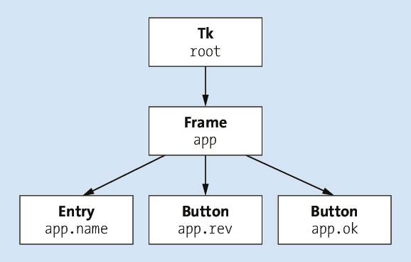 Die Steuerelemente eines Dialogs sind in Tk, ähnlich wie bei anderen Toolkits, hierarchisch angeordnet. Das bedeutet, dass jedes Steuerelement über ein übergeordnetes Vaterelement verfügt. Außerdem darf jedes Steuerelement beliebig viele Kindelemente enthalten. In der Tk-Terminologie wird ein Vaterelement Master und ein Kindelement Slave genannt. Die Hierarchie der Steuerelemente in unserem Beispielprogramm zu Beginn dieses Kapitels soll durch die folgende Grafik veranschaulicht werden: