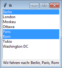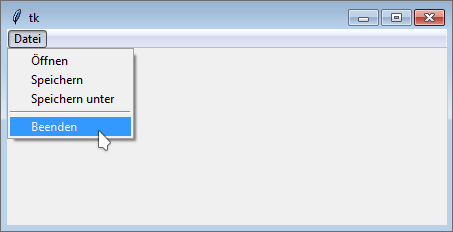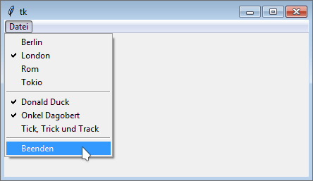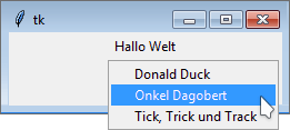Zunächst wird eine Instanz der Klasse tkinter.Tk erzeugt, die den Dialograhmen repräsentiert. Danach instanziieren wir unsere Applikationsklasse MyApp und übergeben dabei die Tk-Instanz als Vaterinstanz. Durch den Aufruf von mainloop in der dritten Zeile wird der Dialog angezeigt. Die Methode blockiert so lange, bis der Dialog beendet wird.