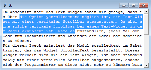 Im Abschnitt über das Text-Widget haben wir gesagt, dass es über die Option yscrollcommand möglich ist, ein Text-Widget mit einer vertikalen Scrollbar auszustatten. Da aber eine solche vertikale Scrollbar bei einem Text-Widget in der Regel erwünscht ist, wäre es umständlich, jedes Mal den Code zum Instanziieren und Anbinden der Scrollbar schreiben zu müssen.