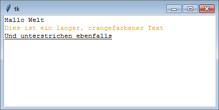 Nachdem die Schriftarten spezifiziert wurden, rufen wir die Methode create_text dreimal, jeweils mit einer anderen Schriftart, auf. Der zu schreibende Text wird über die Option text und der Schrifttyp über die Option font angegeben. Das Beispielprogramm erzeugt folgende grafische Oberfläche: