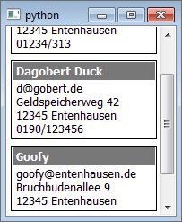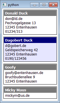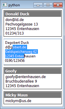 Nachdem die Adressdaten als Liste angezeigt wurden, stellt sich die Frage, in welcher Form Benutzerinteraktionen umgesetzt werden können. In diesem Abschnitt wird das Beispielprogramm dahingehend erweitert, dass der Benutzer einen Eintrag des Adressbuchs auswählen kann. Im darauffolgenden Abschnitt behandeln wir dann das Editieren von Einträgen.