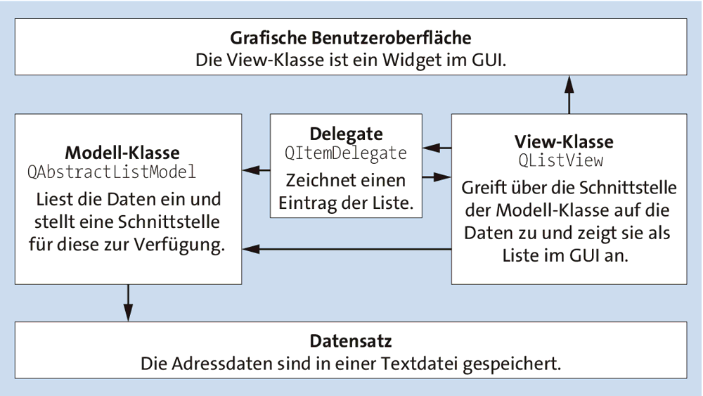 - Die View-Klasse greift auf die in der Model-Klasse gespeicherten Daten zu und präsentiert diese dann in geeigneter Form auf dem Bildschirm. Da es sich bei dem Adressbuch im Prinzip um eine Liste von Adresseinträgen handelt, können wir hier auf die Basisklasse QListView des Qt-Frameworks zurückgreifen, die die grundlegende Funktionalität zum Anzeigen von Modelldaten mit Listenstruktur bereitstellt. Lägen die Daten in einer anderen Struktur vor, könnten die Basisklassen QTreeView oder QTableView verwendet werden, die eine baumartige bzw. tabellarische Struktur der Daten visualisieren.